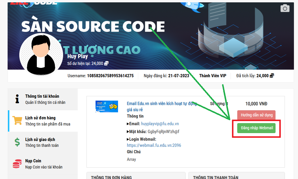 Sau khi đã mua email edu bạn cần vào lịch sử đơn hàng và thực hiện truy cập Webmail để sử dụng email: